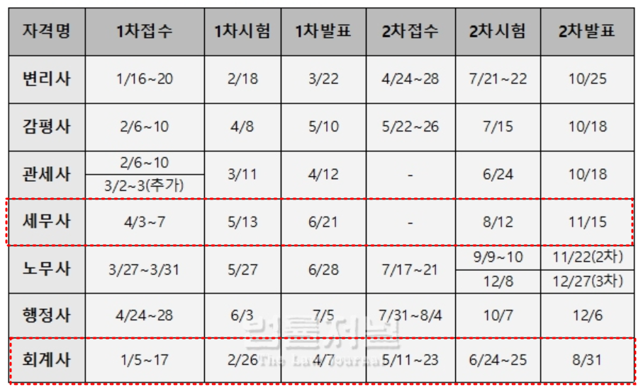 세무사 시험은 5월과 8월에 각각 치뤄지며 회계사 시험은 2월과 6월에 치뤄집니다.