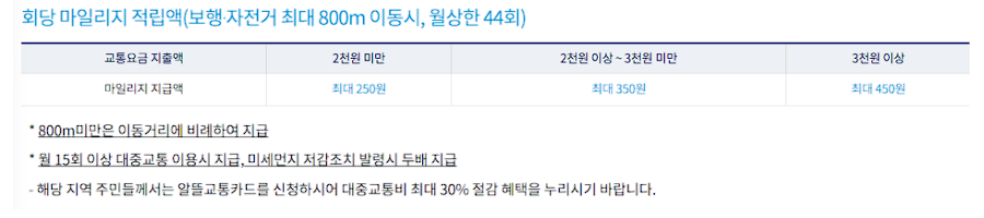월 15회 이상 알뜰교통카드로 대중교통 이용 및 주민등록상 주소지 확인되어야 마일리지 지급됩니다.